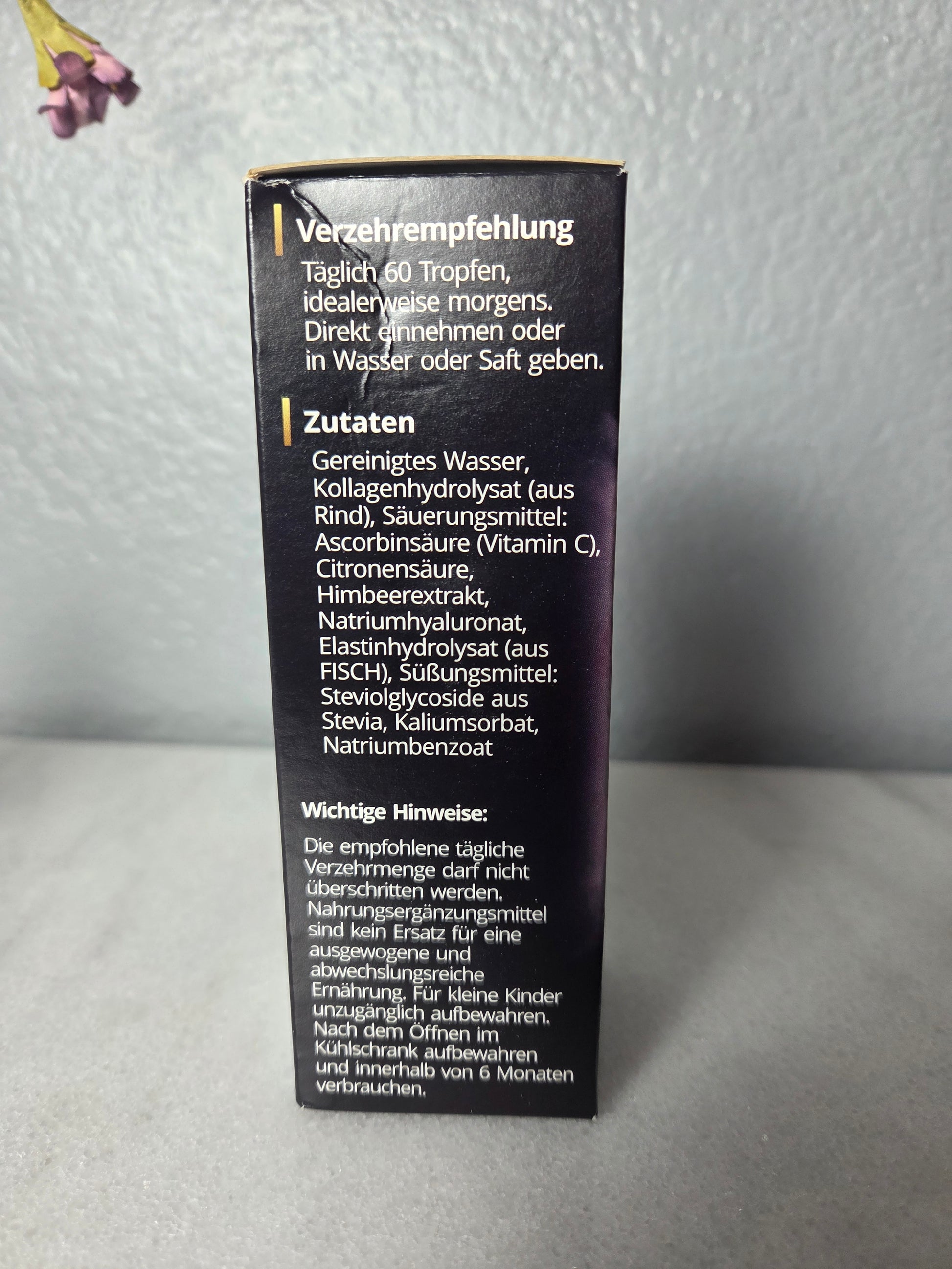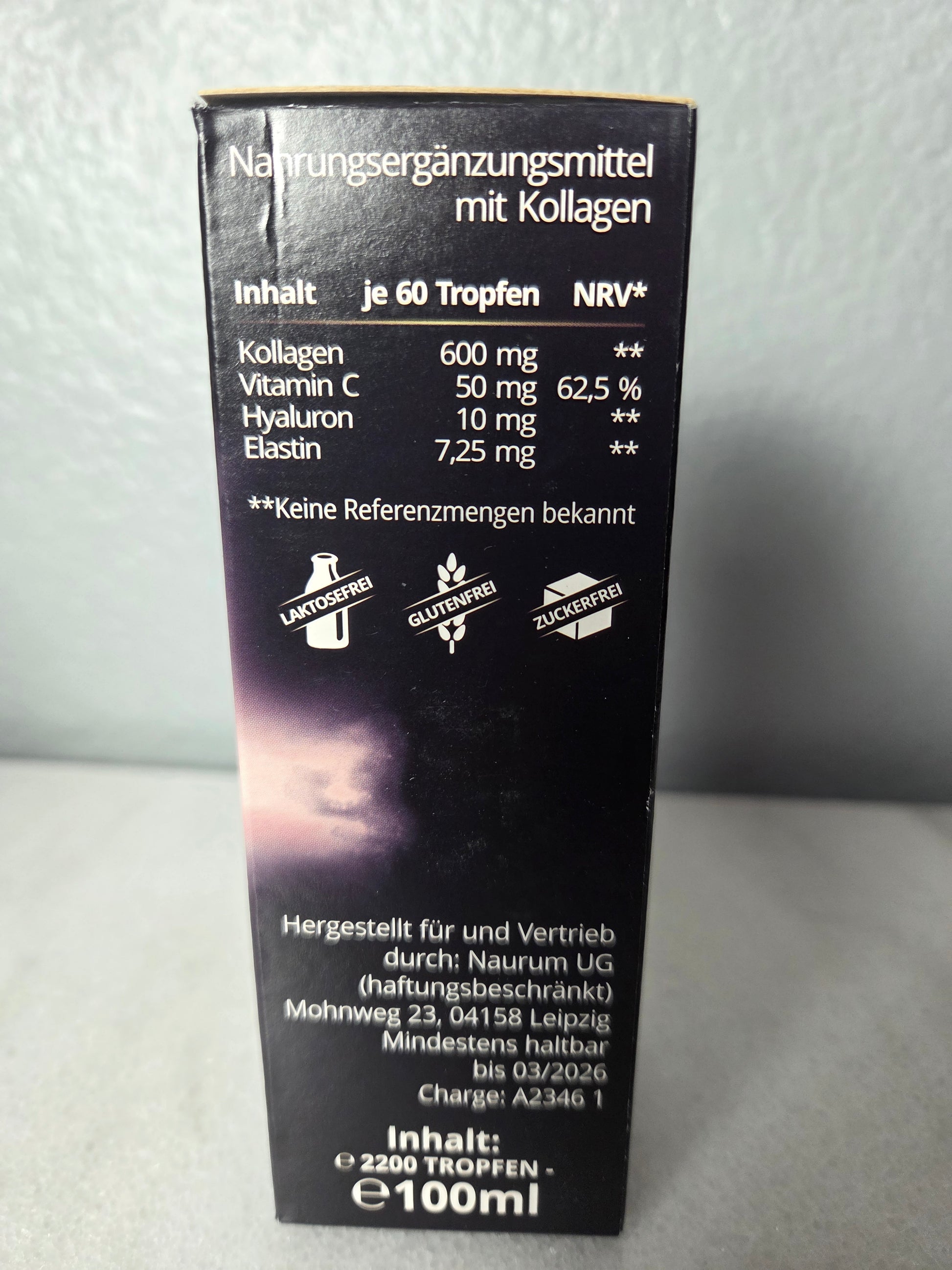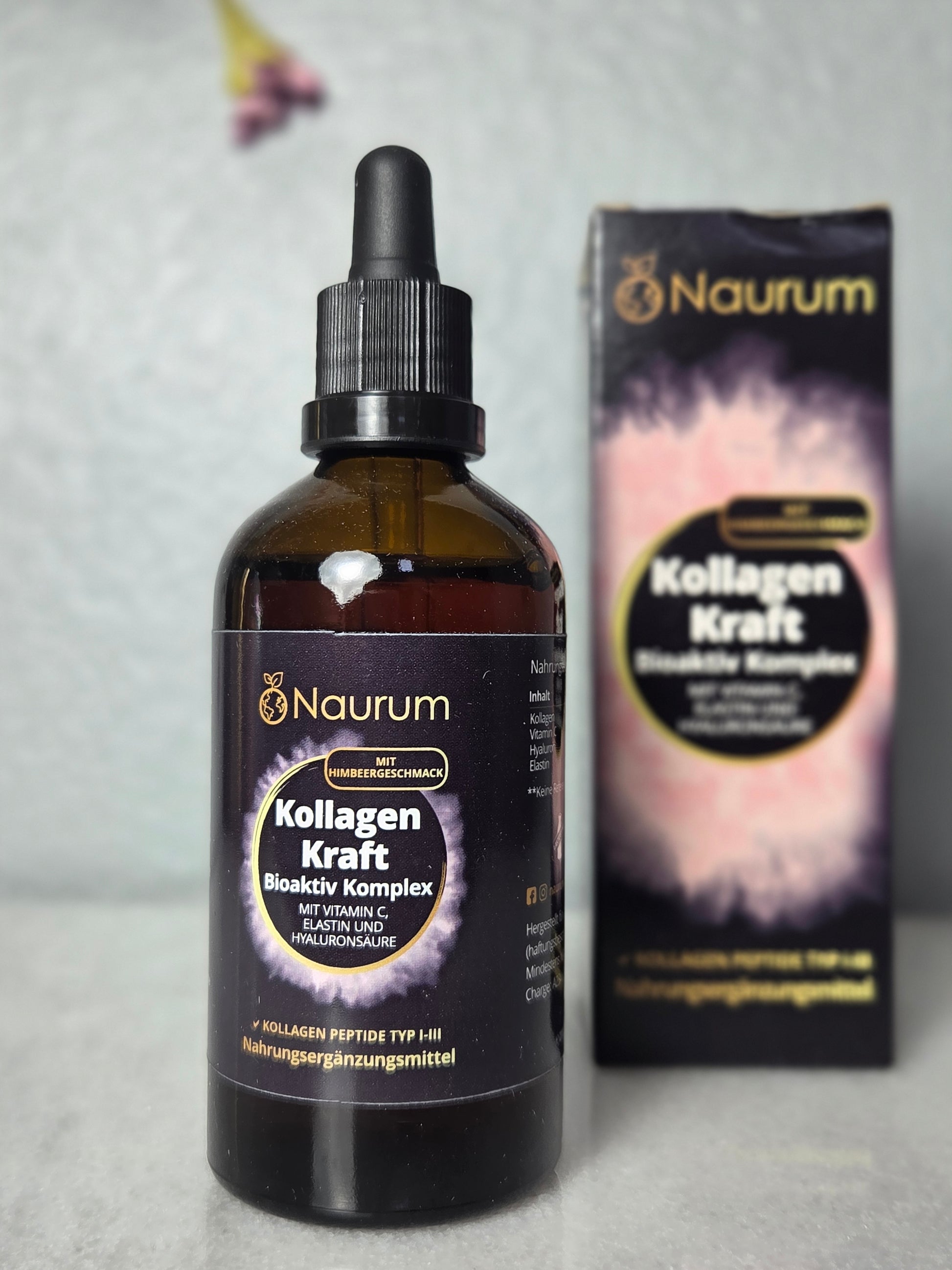 Discover Naurum CollagenKraft! PRODUCT DETAILS Composition Each daily dose of 60 drops contains 600mg of collagen, 50mg vitamin C, 10mg hyaluronic acid and 7.25mg elastin. These ingredients are known to contribute to normal collagen formation for the normal functioning of the skin and joints (vitamin C). Quality ingredients: the collagen is derived from beef and elastin from fish. We rely on ingredients from responsible sources and do not use artificial colours and flavours. Instead, we use natural preservatives such as potassium sorbate and sodium benzoate to ensure product quality. Easy to use: take 60 drops daily, preferably in the morning. The drops can be taken directly or mixed into a glass of water or juice. SAFETY AND QUALITY STANDARDS - Made in Germany: this product is manufactured under strict quality control in Germany to ensure high standards. Transparency: We attach great importance to knowing exactly what you are taking. Our ingredient list is clear and transparent. Consumer information: Do not exceed the recommended daily dose. After opening, store in the fridge and use within 6 months. Dietary supplements are not a substitute for a varied and balanced diet. Keep out of reach of small children. Package contents: one bottle contains about 2200 drops, which corresponds to a supply of approximately 35 days. Support your well-being with Naurum CollagenKraft, a conscious choice for your daily diet